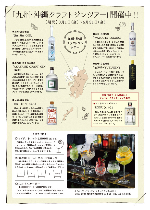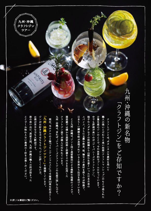 世界的に評価の高い『ジャパニーズクラフトジン』の生産大国とも言われている、九州・沖縄のクラフトジンをテーマとしたフェアのフライヤーを制作させていただきました。
