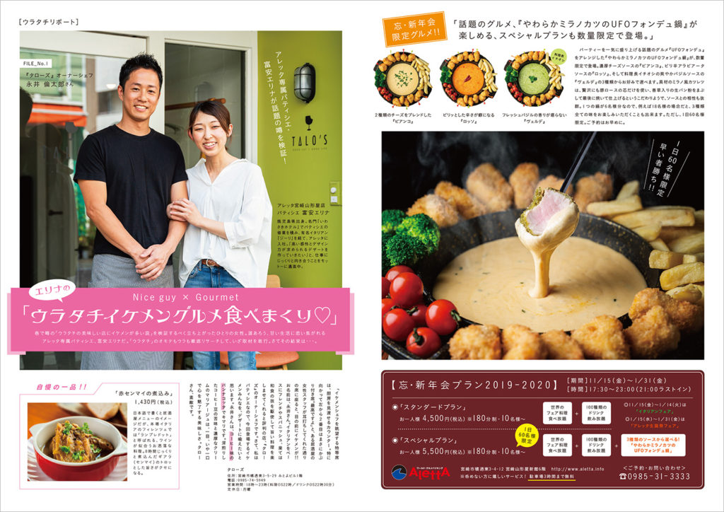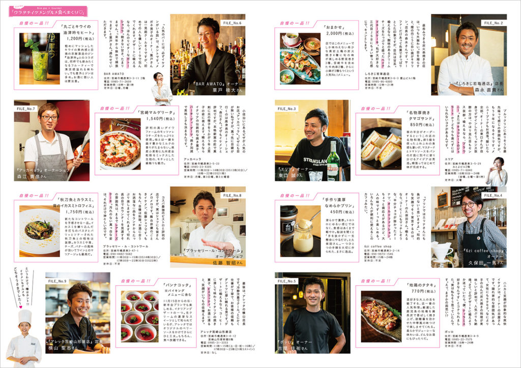 宮崎山形屋の裾野に広がる『ウラタチ(裏・橘通東の略)』と呼ばれるエリアの活性化を目的として「ワールドグルメバイキング アレッタ」さんが発行しているフリーペーパーの第4弾。今回は、宮崎でも注目のグルメエリアへと変貌したウラタチの飲食店とイケメンスタッフを紹介しています。